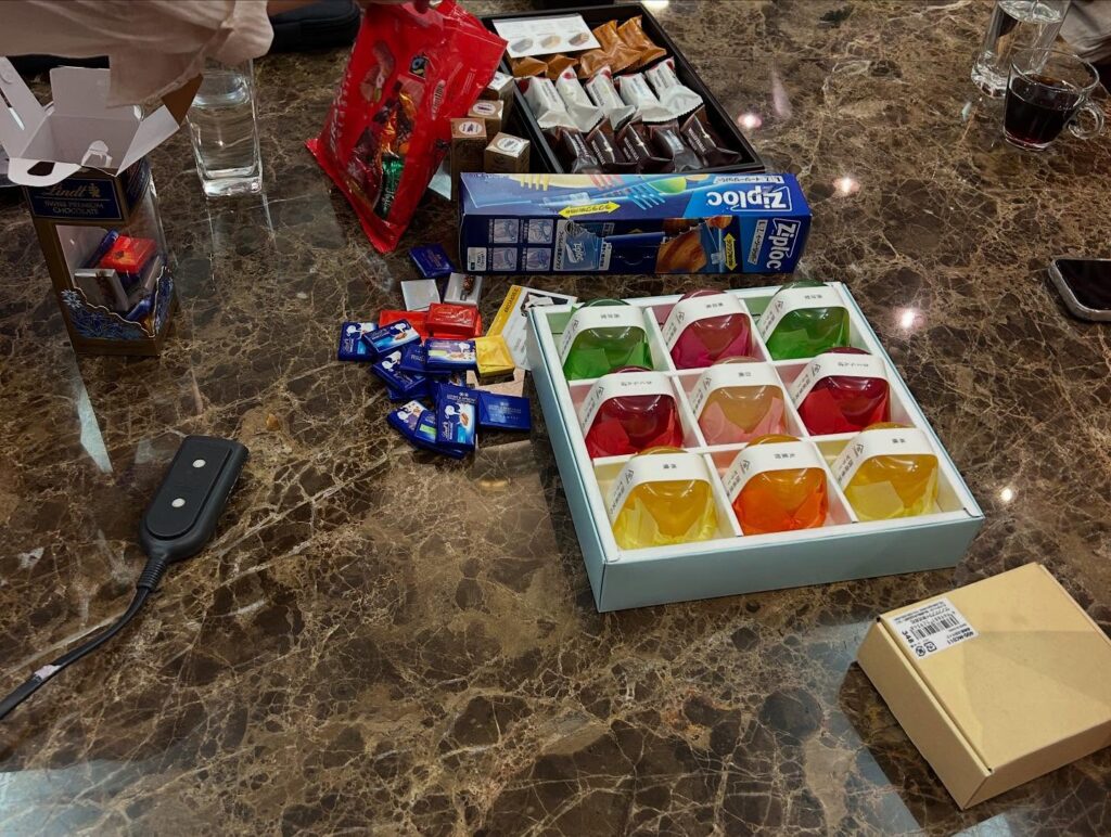 お客様から頂いたお菓子を振り分けたり、私の出張のお土産も広げます
