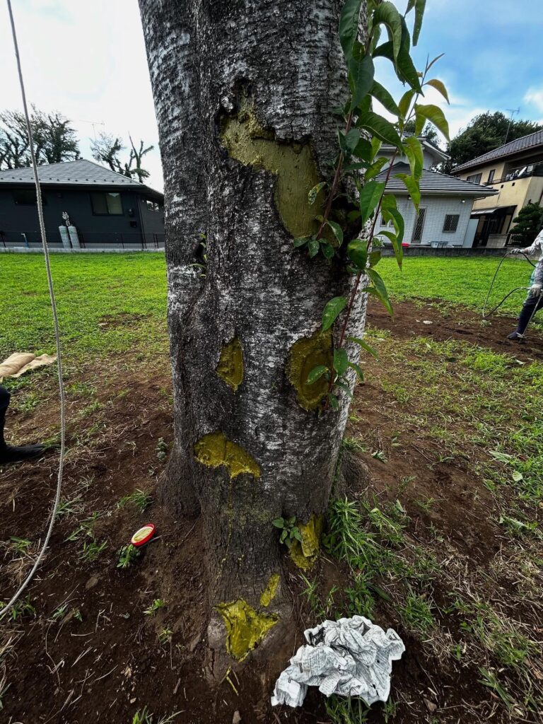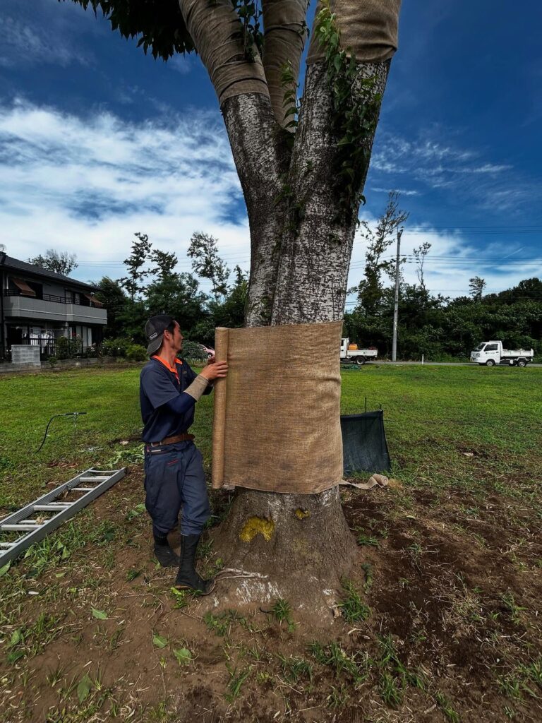 この日はブレスパイプバンブーを中心とした土壌改良と液肥の土壌灌注、傷ついた箇所に薬剤の塗布、幹焼け防止の幹巻を行いました❣️