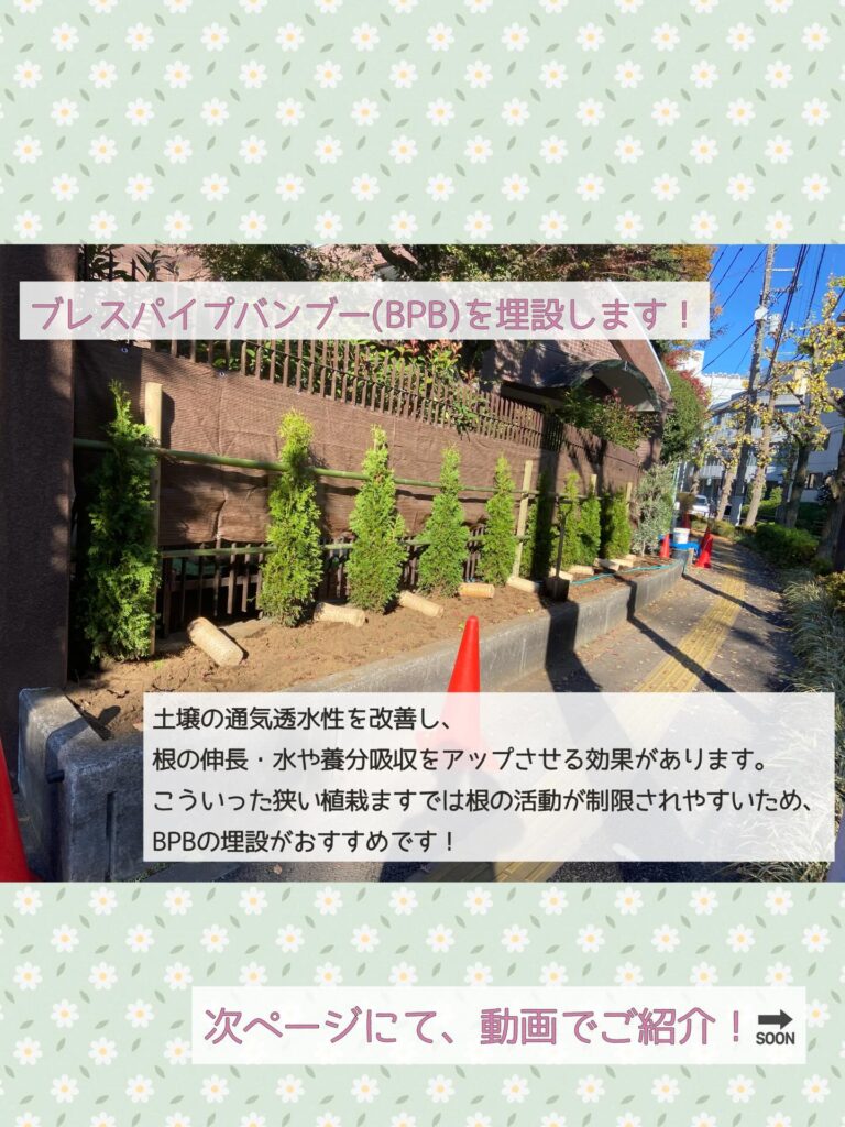 筒形の土壌改良資材である「ブレスパイプバンブー(BPB)」を土中に設置しました。